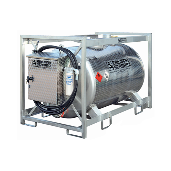 GRG´s Metálicos Ama transportable de acero inoxidable para Jet Fuel, conforme con el ADR, con eje vertical u horizontal, protegido por una estructura metálica y preparado para ser elevado con horquillas de carretilla elevadora. Posibilidad de acoplar un grupo de trasvase insertado en un armario metálico de acero inoxidable, incluyendo bomba manual o de 12V, con manguera y pistola.
